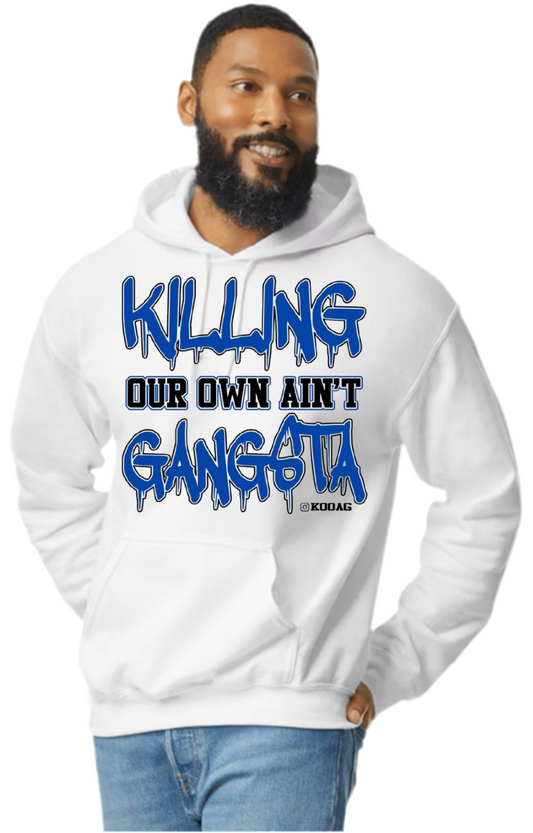White Hoodie Blue Lettering